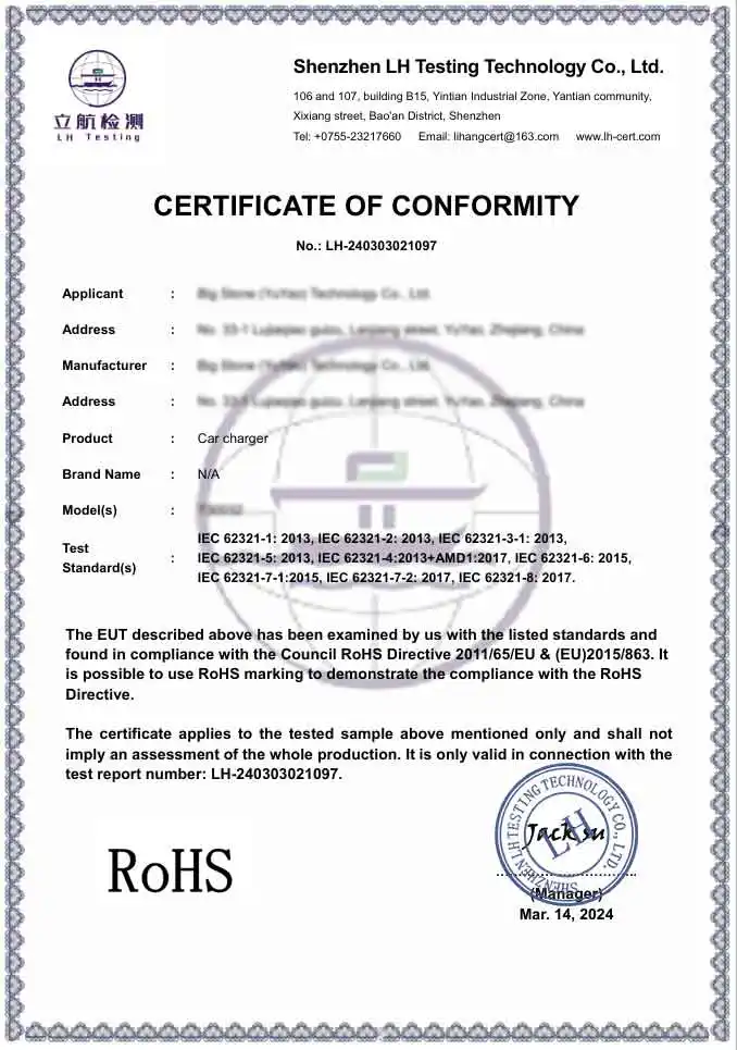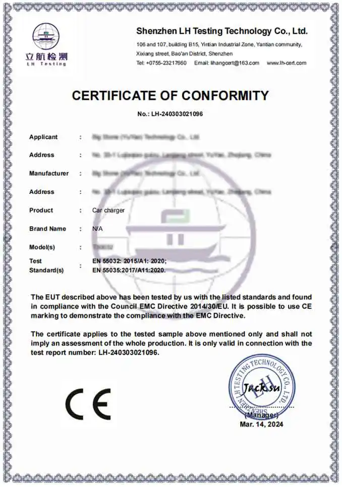Trả lời: Là một nhà máy chuyên nghiệp, các sản phẩm của chúng tôi hoàn toàn tuân thủ các tiêu chuẩn an toàn và môi trường quốc tế. Chúng tôi cung cấp các sản phẩm được chứng nhận CE và RoHS. Hơn nữa, cơ sở sản xuất của chúng tôi được chứng nhận BSCI và ISO, đảm bảo rằng Bộ điều hợp sạc xe hơi của chúng tôi đáp ứng các tiêu chuẩn nghiêm ngặt về kỹ thuật và đạo đức mà các thương hiệu cao cấp toàn cầu yêu cầu.